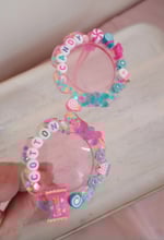 "Cotton Candy" is on the top in pretty Colorful Beads along with pink/blue gummy bears, mini flowers, assorted candies which will vary but be of the same Color Scheme. 🍬