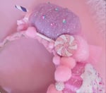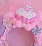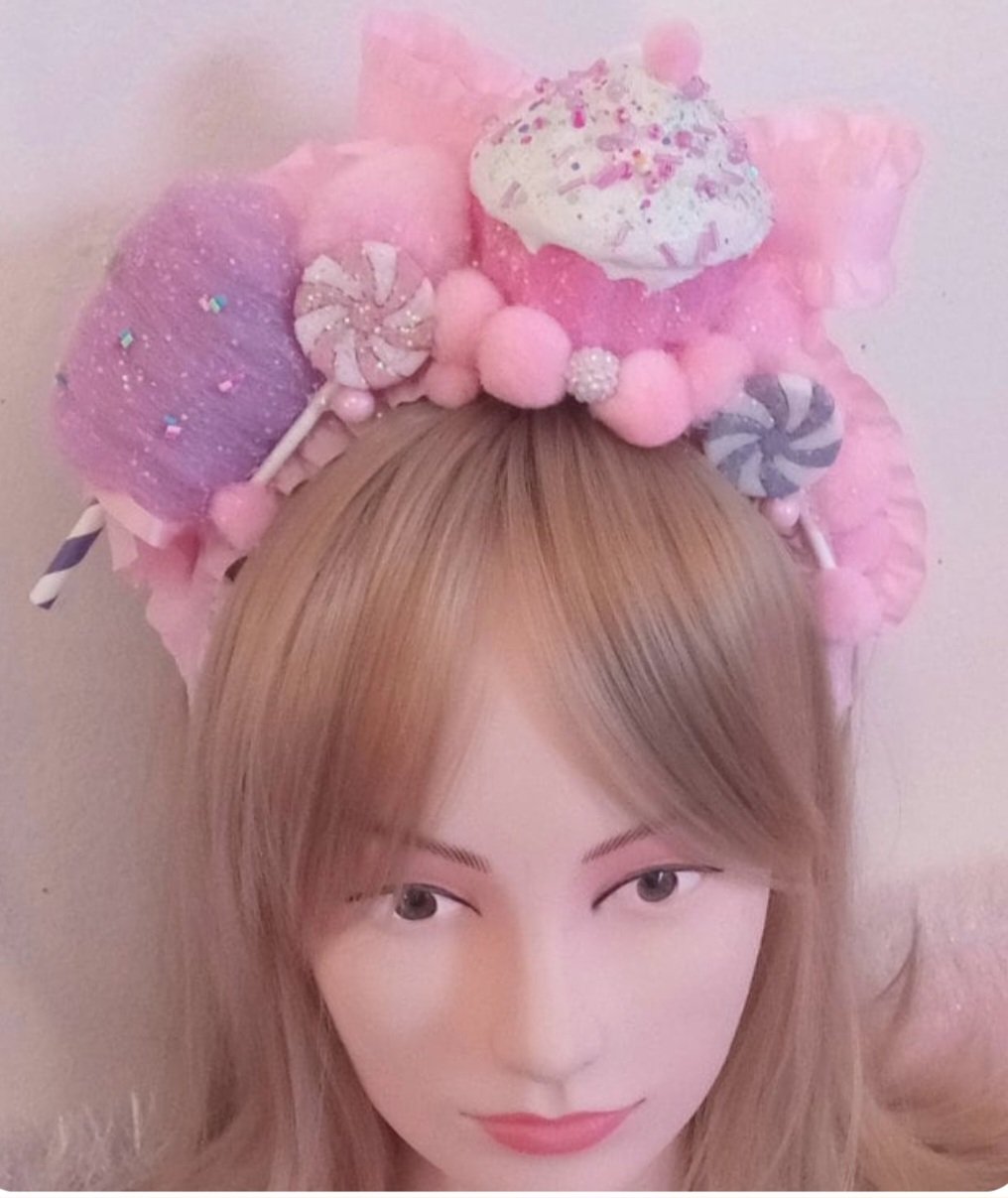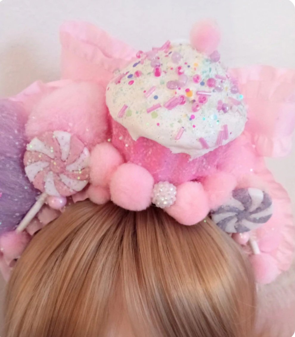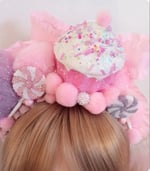 On top of the headband there is a regular sized Cupcake, a small lavender Cotton Candy with Sprinkles, two fake lollipops; one on each side, pink pom poms and pretty beads as shown. There is a pink ruffled ribbon situated behind the cupcake.