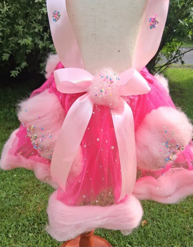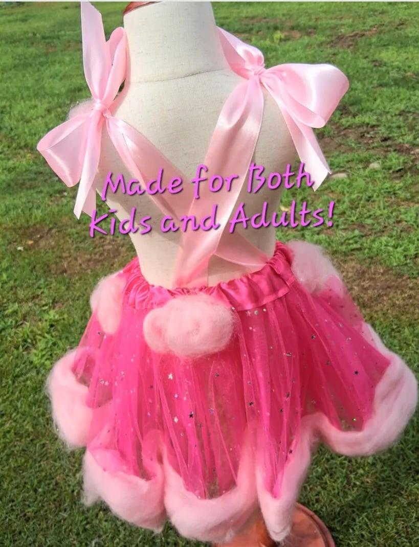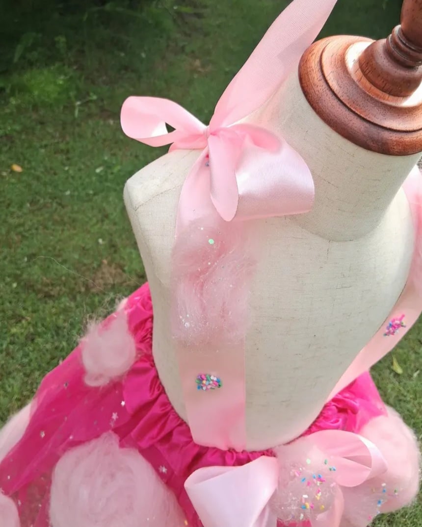 This Unique dark pink 4 layered tutu skirt is done with faux Cotton Candy around the Base, in Batches throughout, and on the Ribbon Suspenders as well.