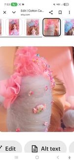 Both Cotton Candies are made from roven wool yarn and are topped with assorted Candies which will Vary, Rainbow Sprinkles, and a Sprinkle of Glitter.