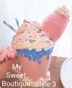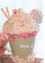 STYLE 3 is a pink mug with blue drippings, a mini pink cotton candy with faux whipped cream, and Sprinkles.