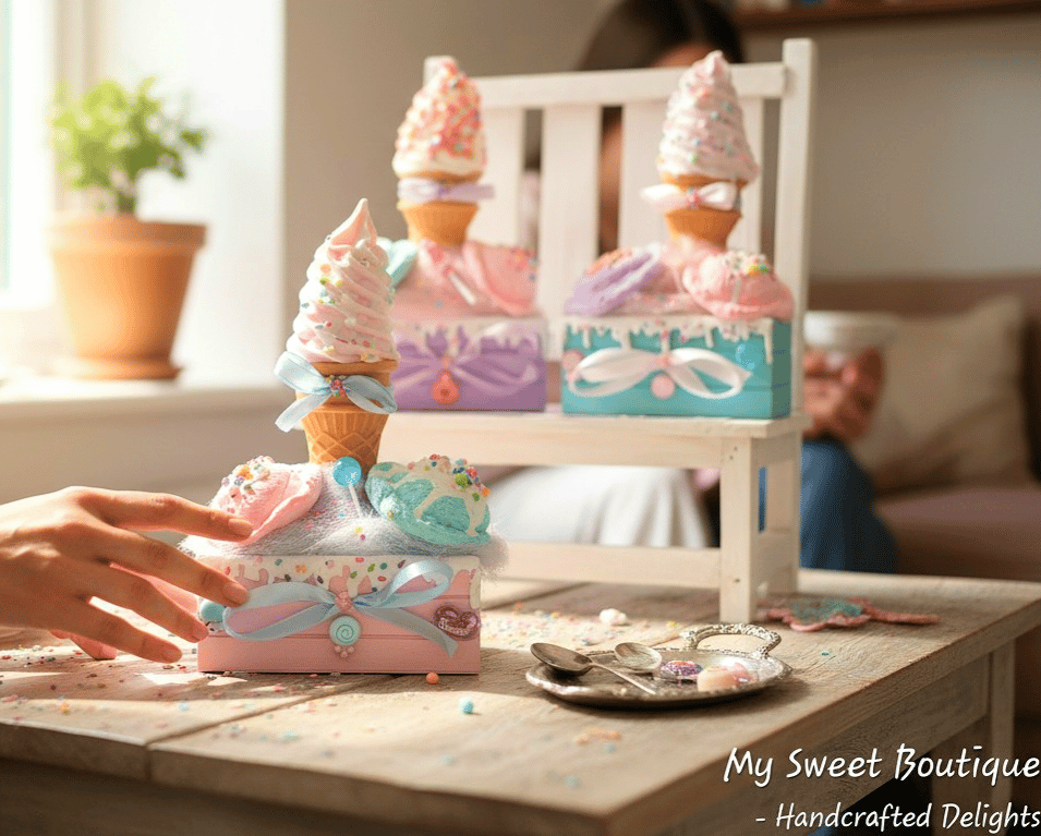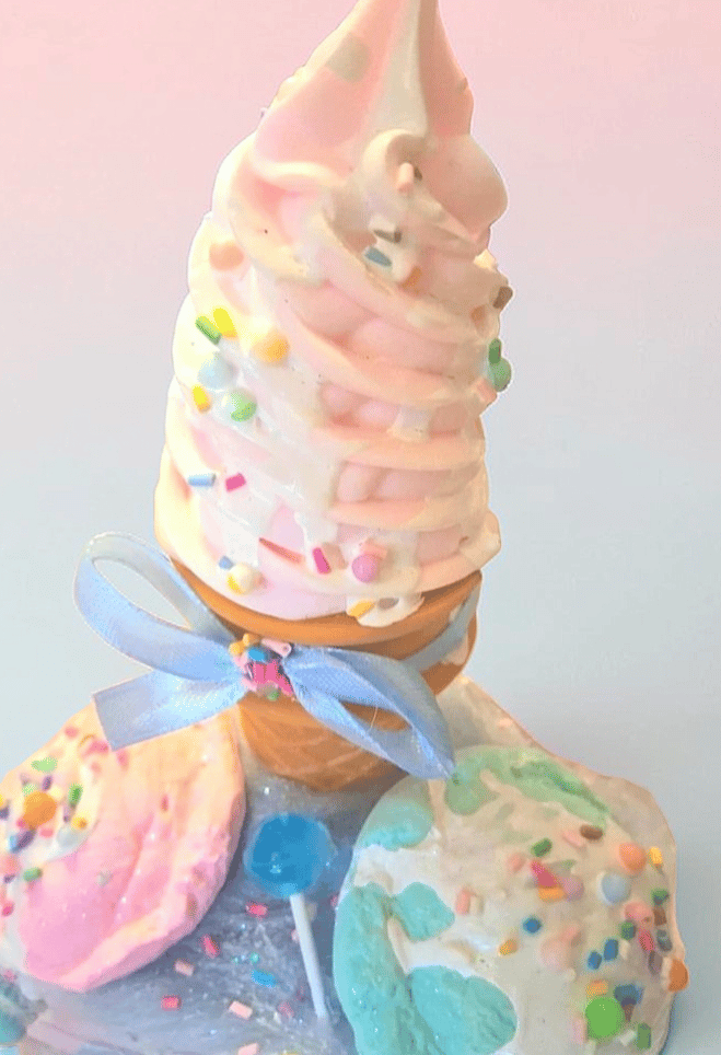 The crate is painted then done with fake white ice cream melting on the sides with Sprinkles.