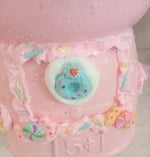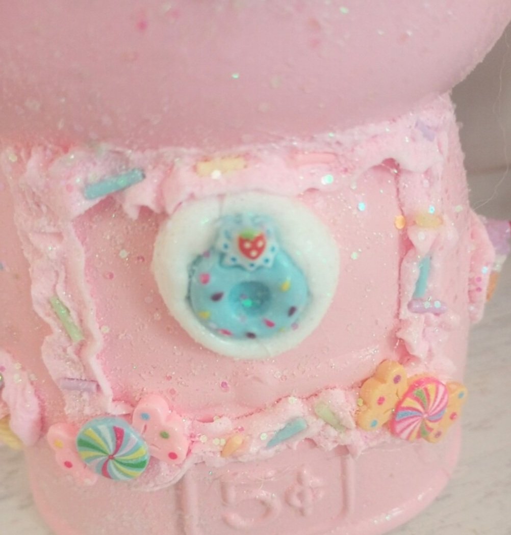 The Glass Gumball machine is decorated with faux Candies which will Vary, Pretend whipped topping, and Glitter (Sealed in with glue).