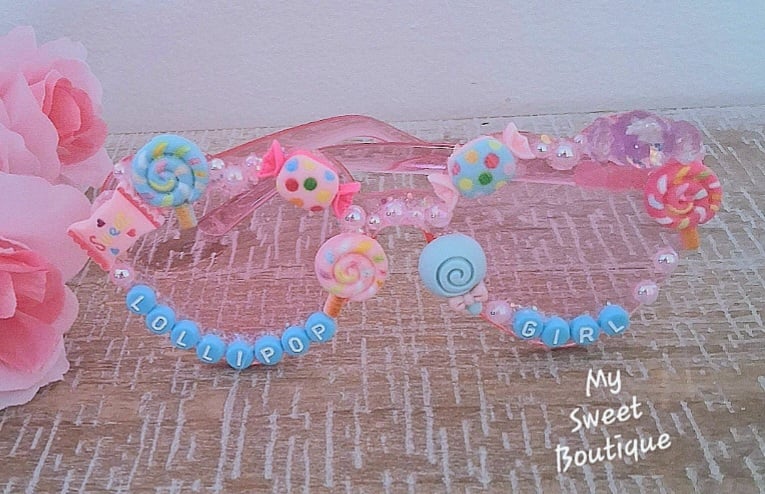 The Shades are embellished with pink/white gems, lollipops and candies 🍭 , with " Lollipop Girl" done in blue beads.