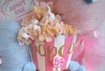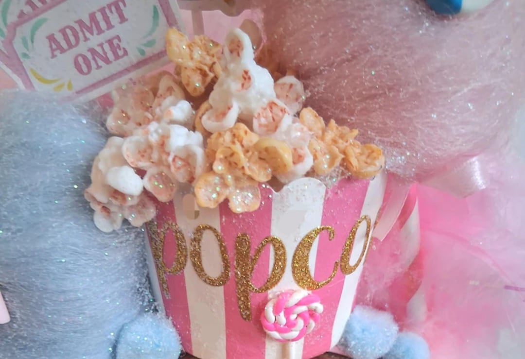 A pink and white striped Popcorn Container is topped with realistic looking fake kernels with the word, "Popcorn" done in gold glittered letters.