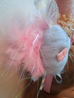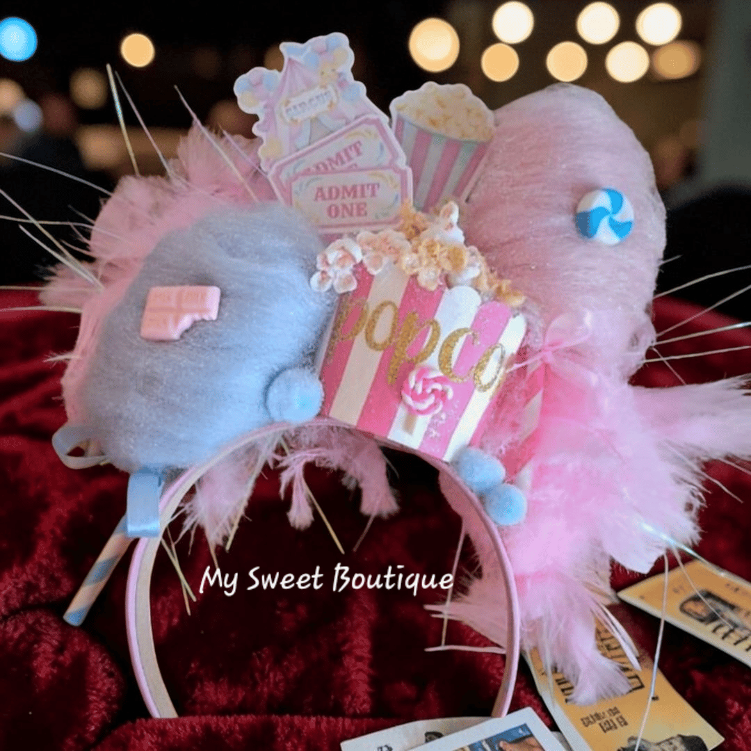This is done on a quality pink flexible headband. It comes with a faux light pink and a faux light blue Cotton Candy.