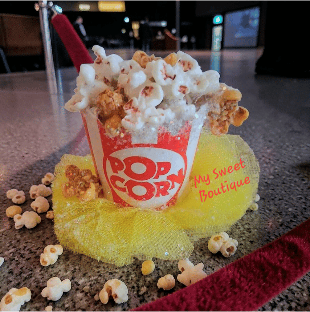 The small popcorn container is Situated on Yellow tulle. The entire piece MEASURES approximately 5 inches wide at the base by 3.75 inches high.