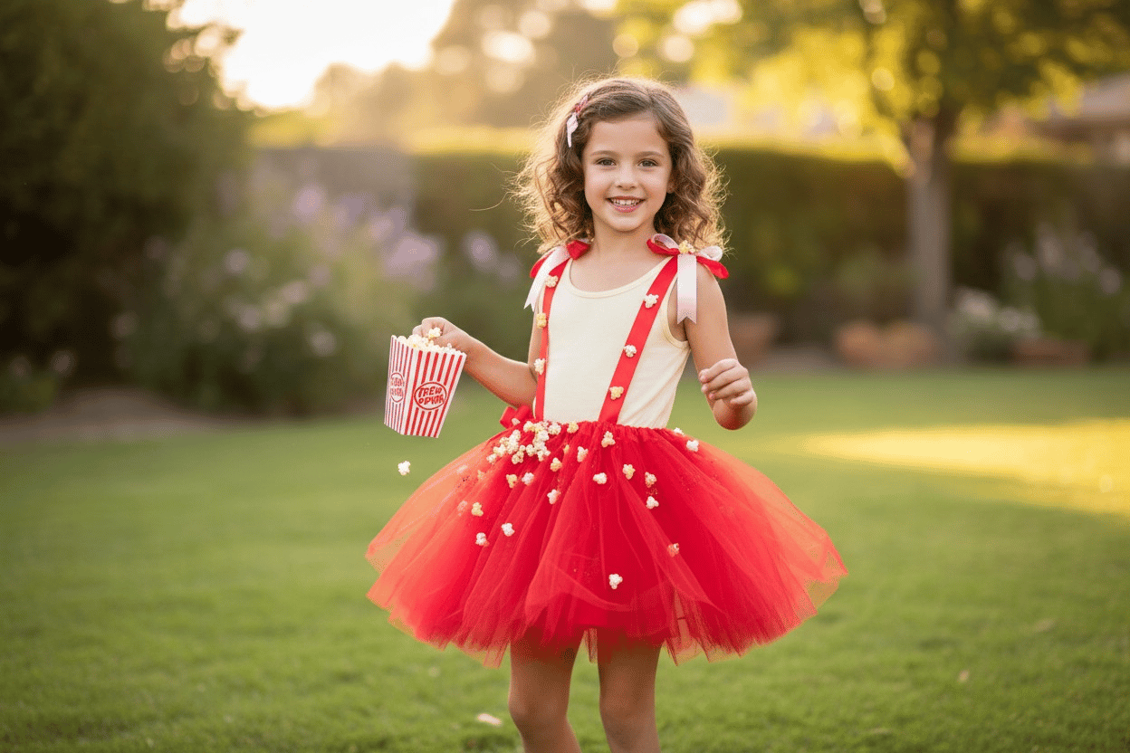 A fun Popcorn Themed Outfit with Optional Fascinator made for Both Kids and Adults.
