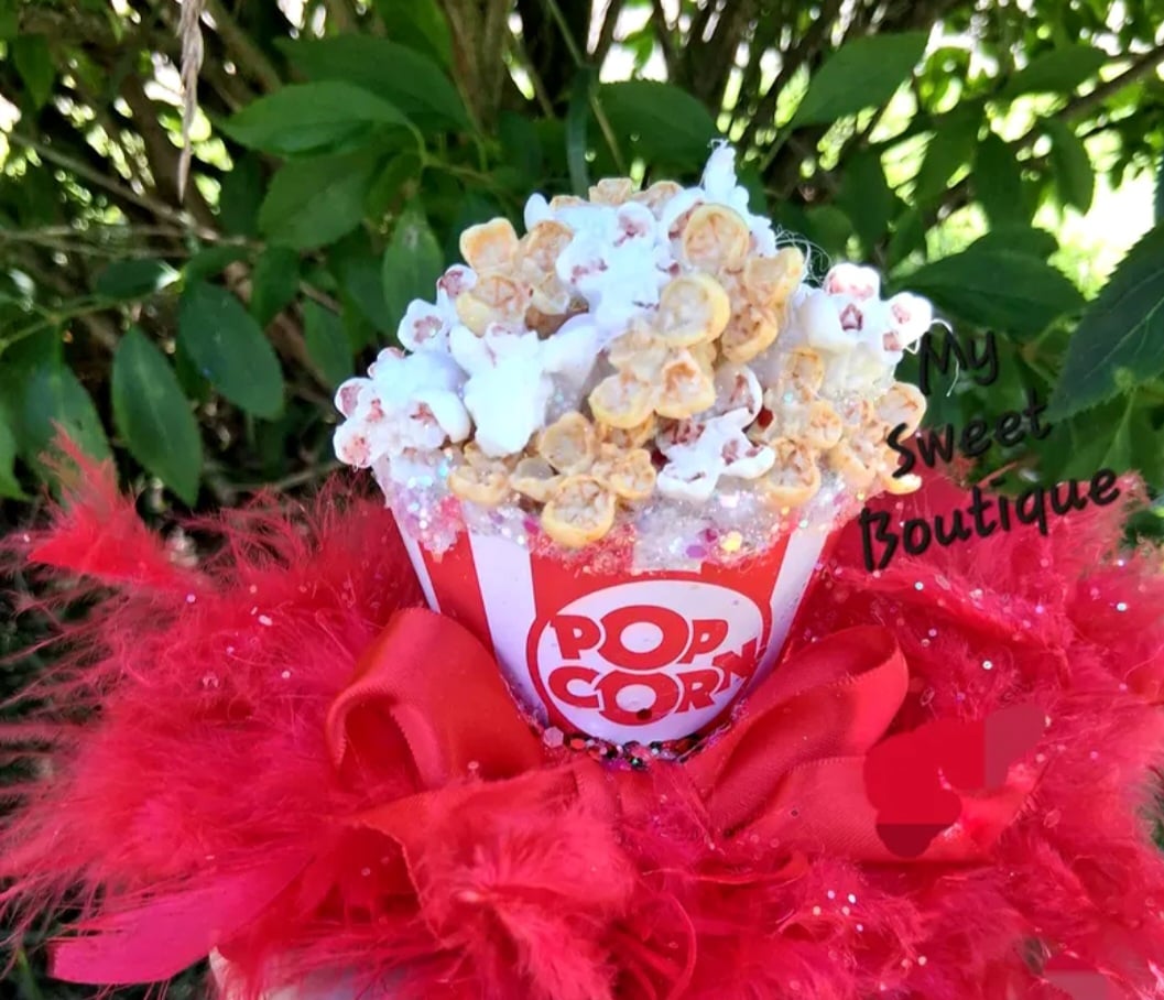 Embellished with Realistic looking Popcorn 🍿 kernels, a red/white Bow and a Pink Cotton Candy on the Side. *** If you'd rather No Cotton Candy on the skirt simply leave a Note when ordering. Thank you.