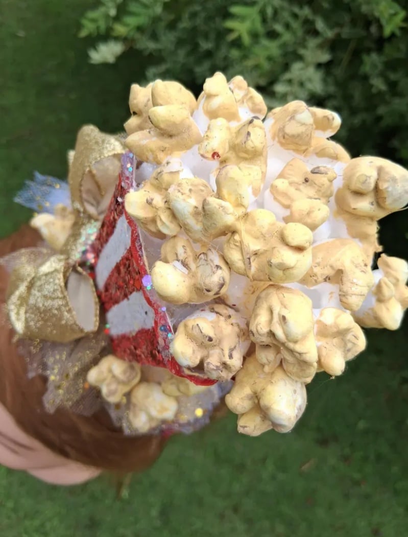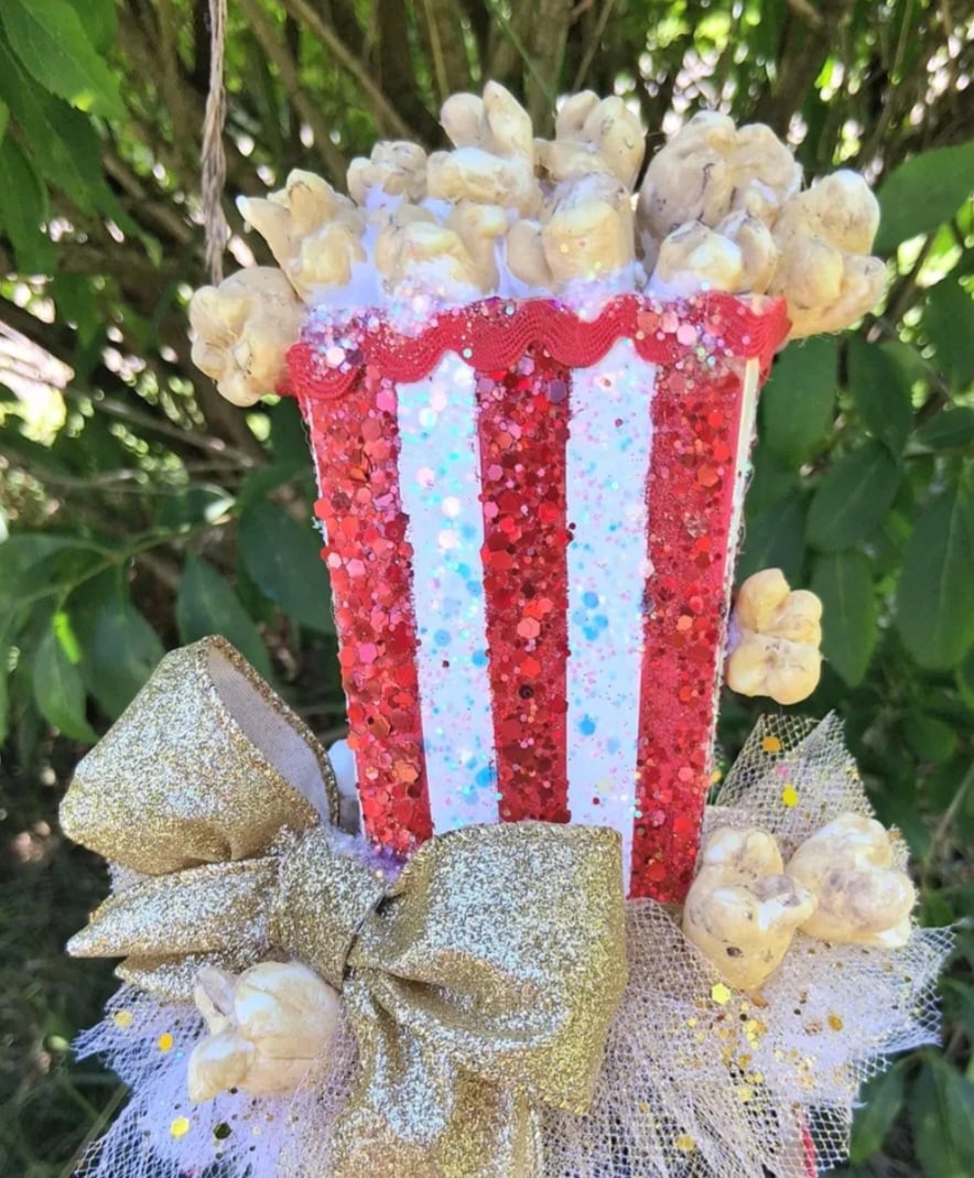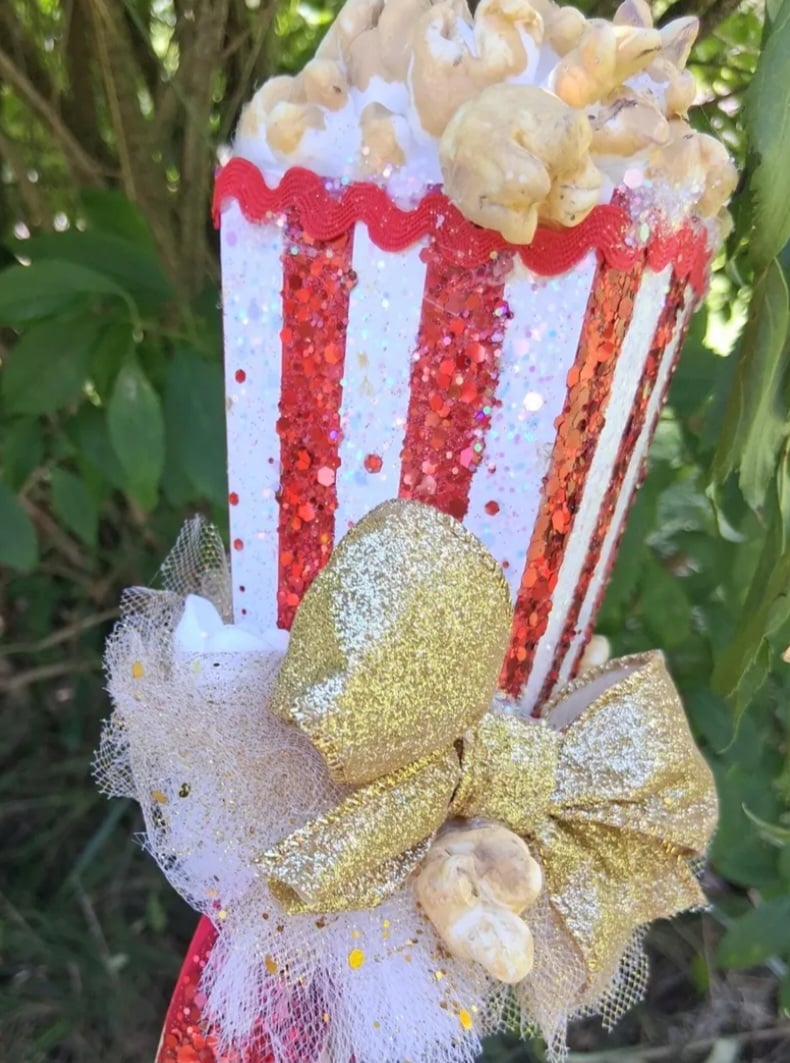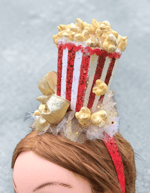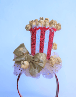 The tall Popcorn Container is done with red/white chunky glitter with the kernels being handmade with foam clay. Gold and White tulle sit on top of the headband along with a gold ribbon bow set to the side.