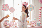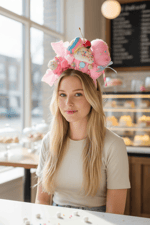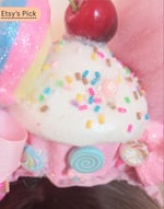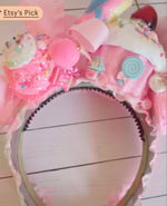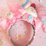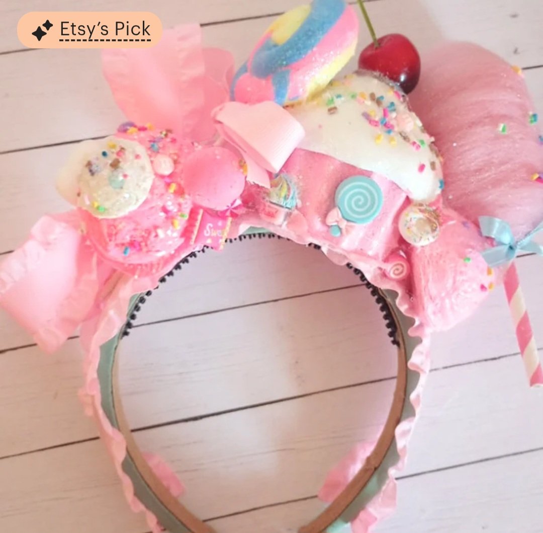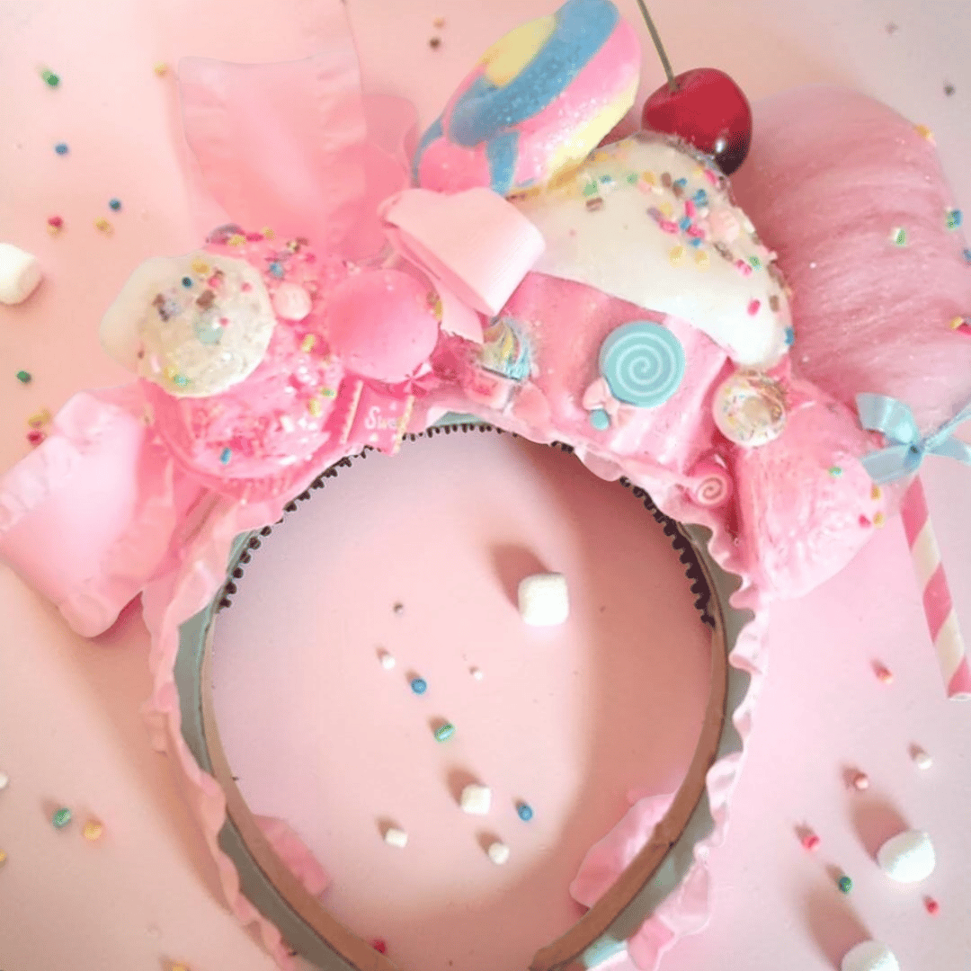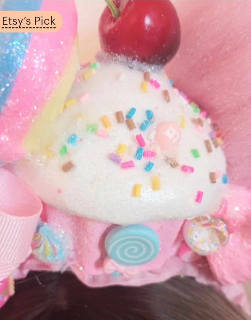 On top of the headband you will find a life-size cupcake with an artificial cherry, two pink fake ice cream scoops with colorful sprinkles, a lollipop, a small marshmallow with a pink bow behind it, fake candies which will vary, and a pink cotton candy.