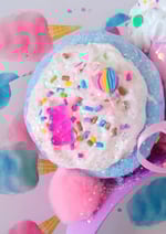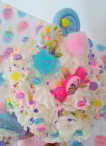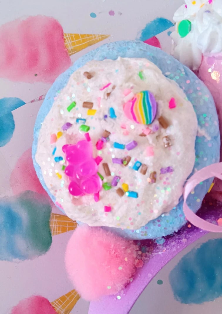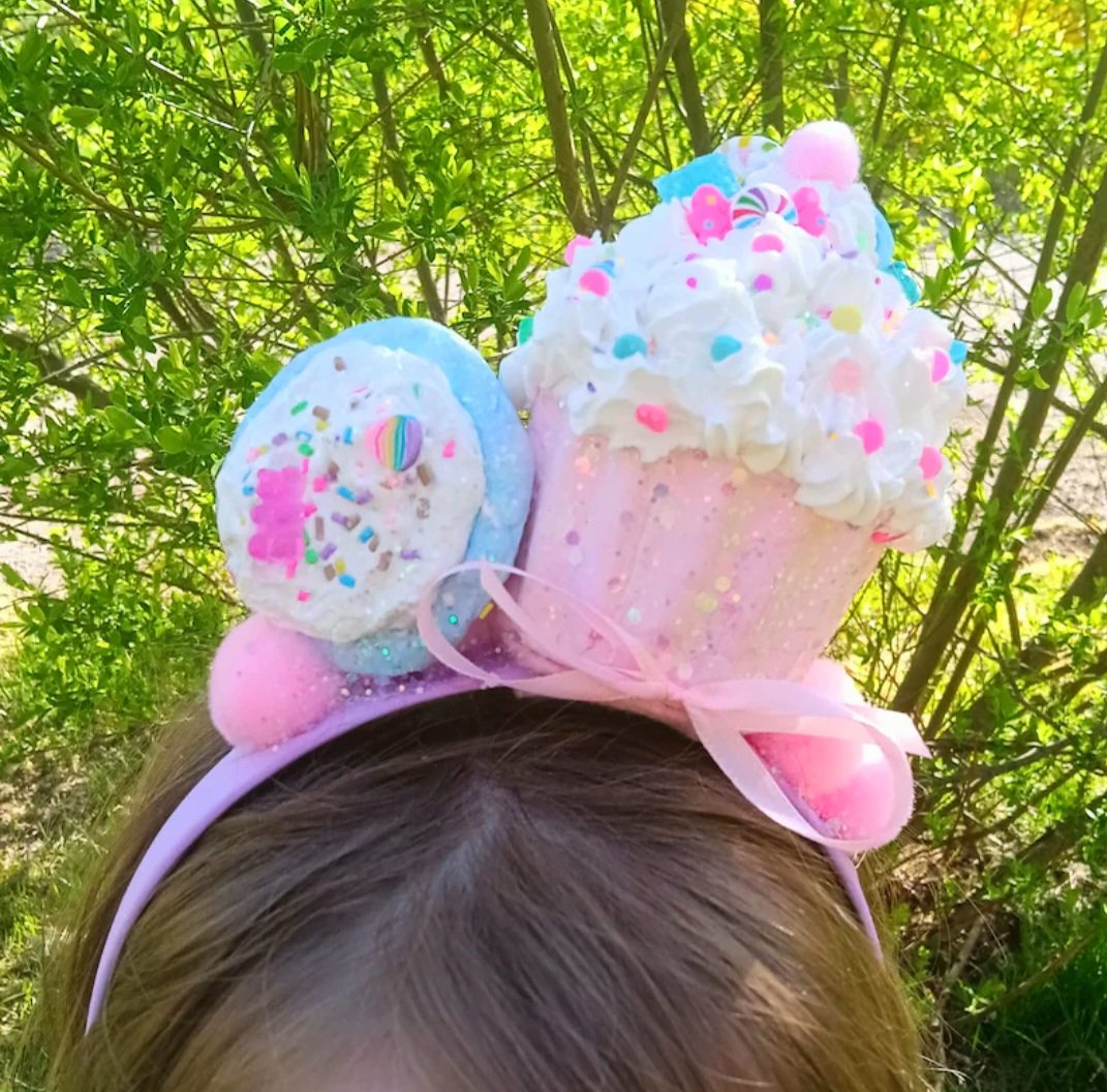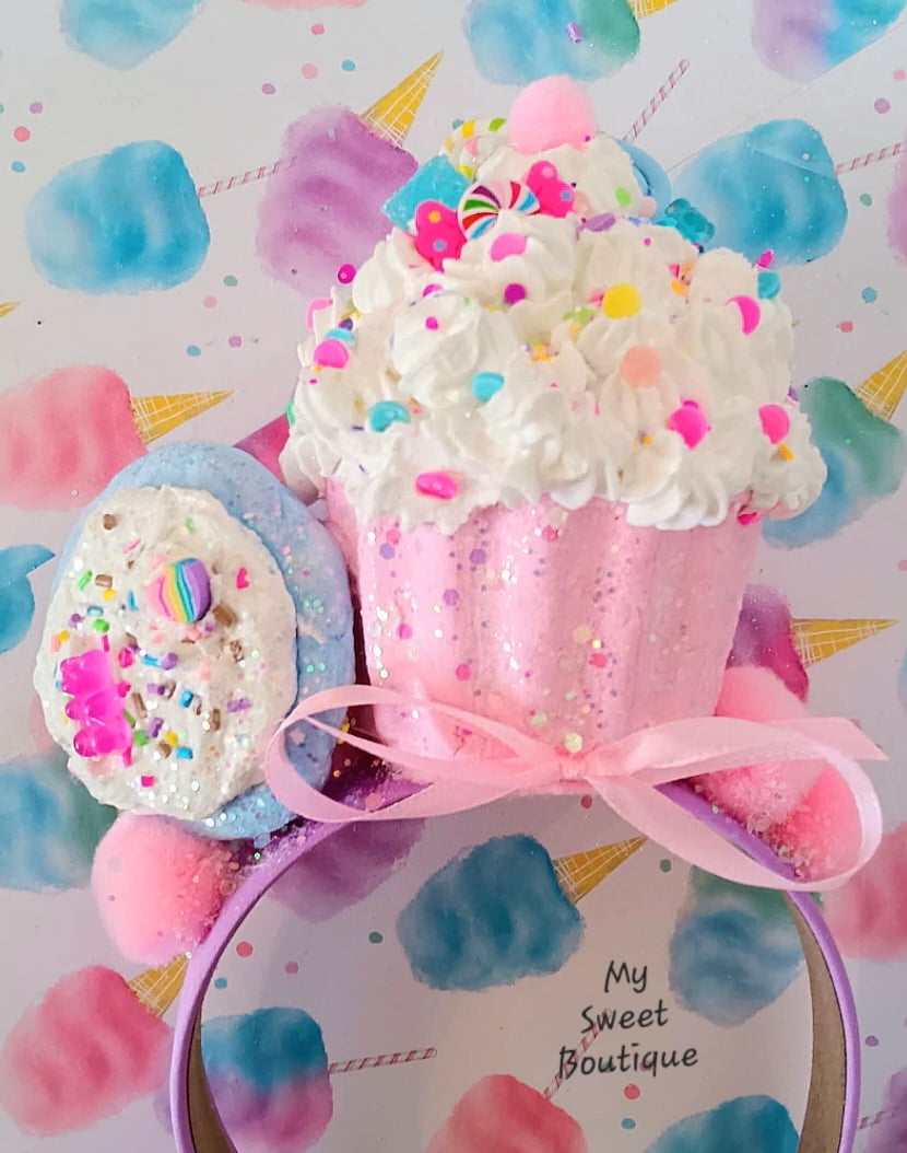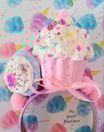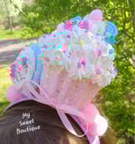 Whimsical Sweets Themed Crown done with a Life-Sized Cupcake in light pink with white frosting Sprinkles and Candies, and a light blue Sugar Cookie with Candies/Sprinkles.