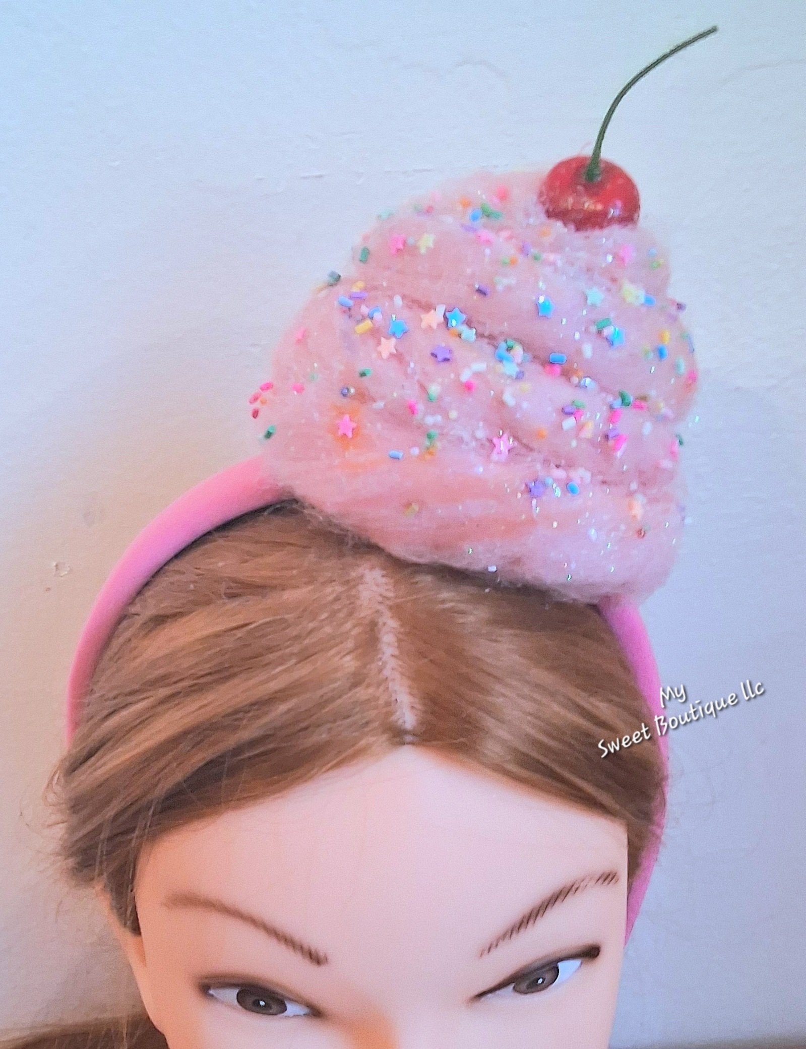 Adorable Whipped Topping Headband done with Yarn, Colorful Sprinkles, a Realistic Cherry, and Glitter. Everything is Sealed with a Spray adhesive.